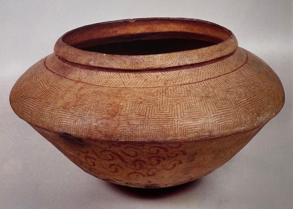 The urn is painted with intricate geometric patterns thatare separated into discrete categories using the natural shape of the urn. The artisan of this object used a red paint, a color that was quite often employed by the Tupi-Guarani. The complexity of the design and care of the lines reveals the maker’s skill and close attention to detail. patterns were not merely decorative, but also carried particular associations, which are still being studied and identified.